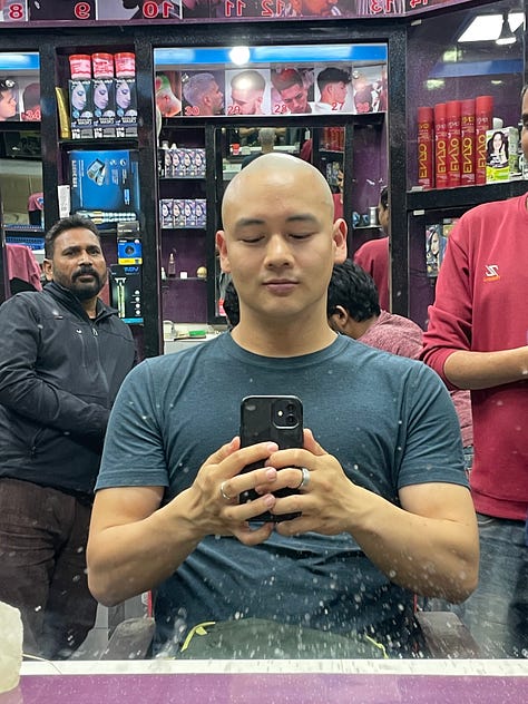 200 rupees for a haircut. It took longer than I expected. Hair fell quickly under the quiet buzz of the clipper, the realization only taking hold once the hair that covered my forehead began to fall over my eyes. Watching the grey stubble on my scalp that marked my hairline, I thought that the process was over. But the barber took out a razor, sprayed some oil on my head, and began shaving down to the scalp. Grey turned into white, revealing skin that had never before seen the light of day. He worked slowly, brushing clumps of stubble off onto the back of his hand, stretching my skin beneath his fingers. After the last pass, he ran what looked like a crystal beneath the faucet and rubbed it over my bare head, pressing my head between his hands. And here we are. My head does not feel much lighter. It feels no cooler. Myself, I am no different. I never realized how warm my hand is. The warmth of my own touch.