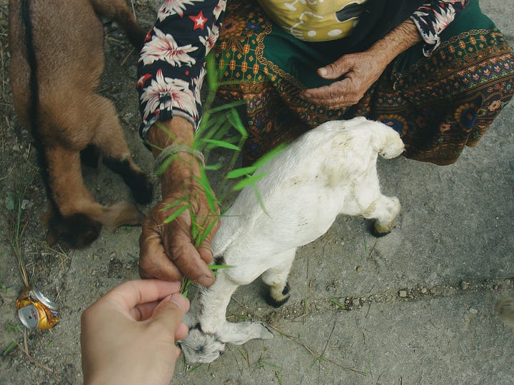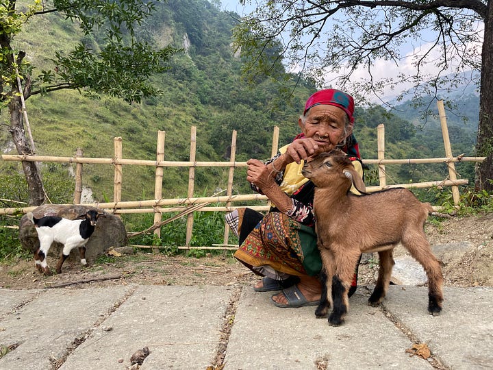 I discover the wonder and joy of baby goats. Plucking vegetation off the side of the trail with one of the villagers. Watching them nibble at the tablecloth during breakfast. At some point in life I will raise goats, releasing them onto the world like little lawnmowers. Baby goats are better than dogs.