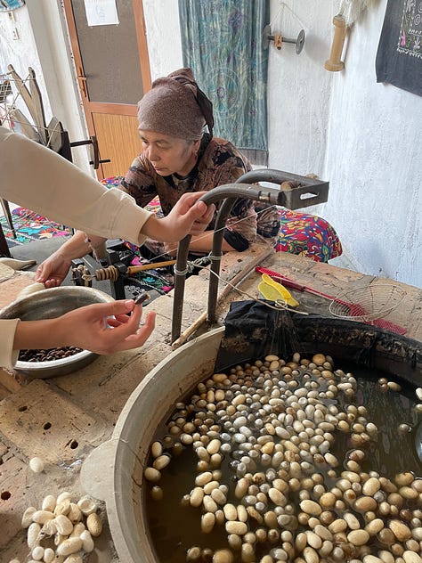 Locals spoke proudly of that new hotel. Yet many of us trekkers were drawn to smaller, more intimate homestays. There seemed to be such a mismatch between what locals took pride in — perhaps what they saw as progress — and what foreign travelers like me were seeking. It is here that I would like to introduce a complicated dynamic — something that will certainly come up again in my future writings. Formerly disconnected regions of the world [whether geographically, financially, or politically] are experiencing an influx of information and cultural exchange made accessible by cheap electronics, increased connectivity, and prevalence of social media. As I am writing this months after my time in the Balkans — this statement also reflects my time spent in Kazakhstan, Kyrgystan, Uzbekistan, and Nepal. On one hand, these tools can be used to amplify and uplift individual cultures and ways of life — showcasing the beauty of their traditions and increasing opportunities for self determination, social mobility, and more. One example of this is with a family-run silk textile production facility in Margilan — the silk production center of Uzbekistan that dates back to the Silk Road.