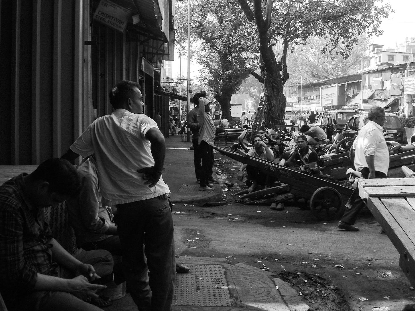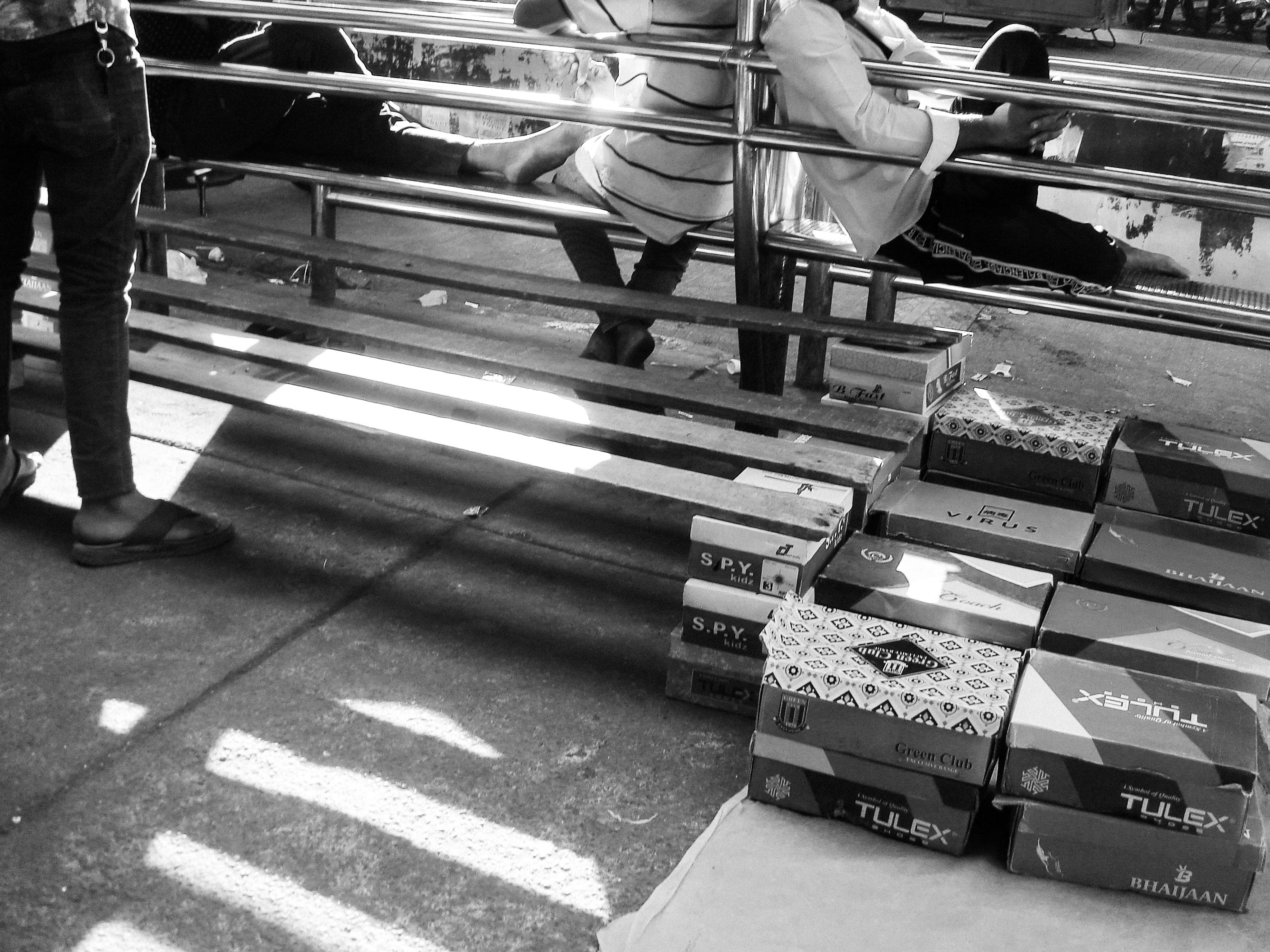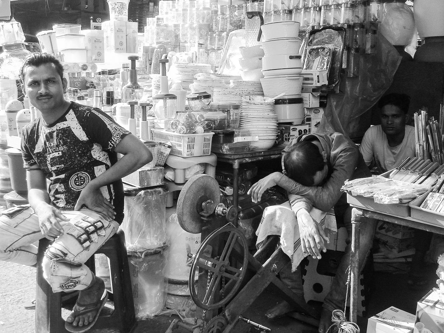 The bazaar consists of stalls fashioned from bamboo and tarp: ceilings made with sandwiched carpets and cardboard, from which plastic-wrapped metal plates, cutlery, plastic containers, and other assortments dangle earthward. I position myself in an eddy amid the river of people, photographing the stalls against a backdrop of concrete and fading paint. A shopkeeper sitting on a stool nearby waves me over. He mimes a photograph and points. I cut through the flow of people and he points again, to the man beside him: asleep, head resting on crossed arms, seated by a grindstone. He smiles and motions for me to take a photo. I oblige, stepping back to catch the entire scene. Both victim and perpetrator.
